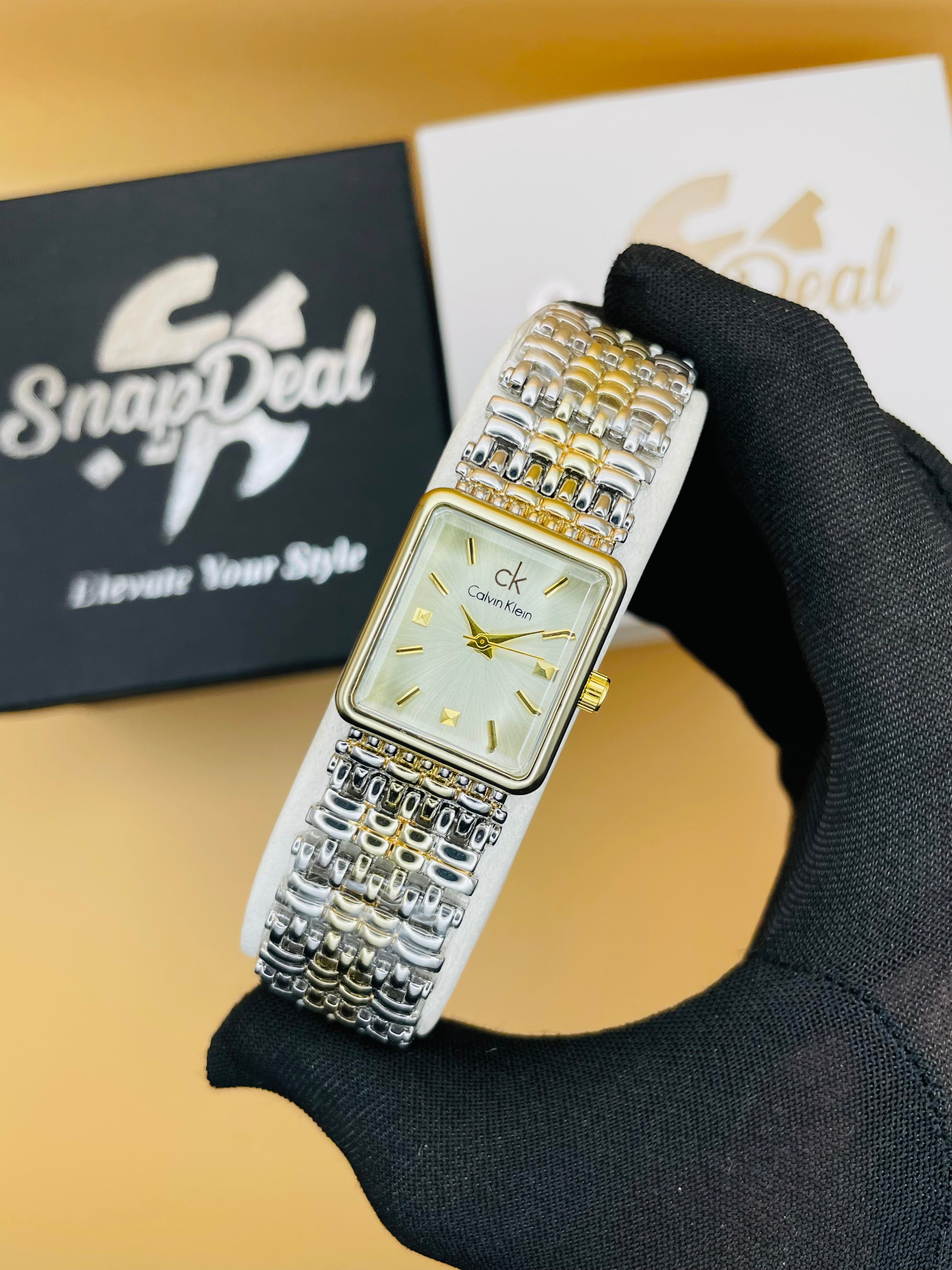 CK - Golden-Silver Rectangular Dial Bracelet Watch